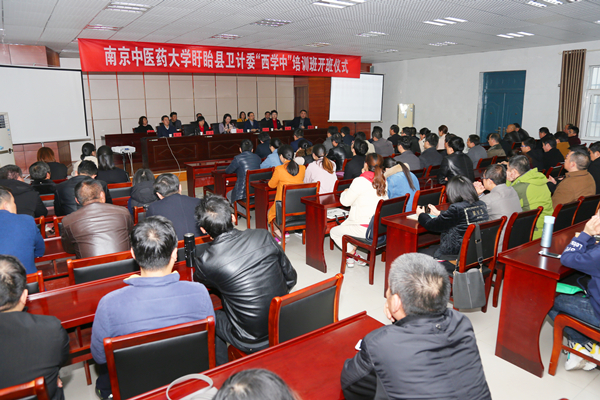 2018年11月24日下午,南京中医药大学与盱眙县卫计委合作开办的“西学中”培训班开班。南京中医药大学副校长徐桂华、继续教育学院院长文庠,淮安市卫计委俞伟男副主任,盱眙县人民政府雍梅副县长,盱眙县卫计委葛云主任以及相关人员出席了开班仪式。
