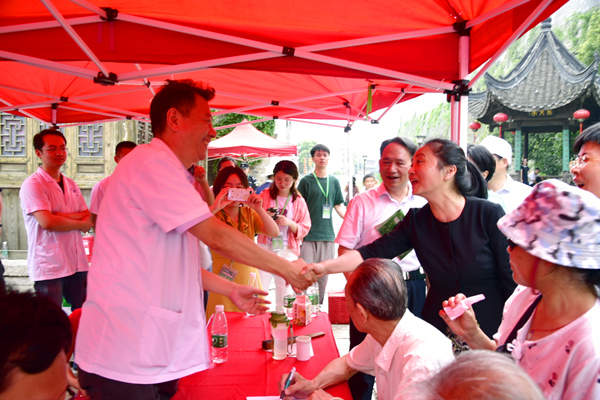 江苏省卫生和计划生育委员会副主任、江苏省中医药局局长朱岷,南京中医药大学副校长黄桂成慰问义诊专家