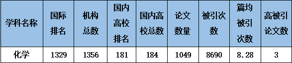 本期ESI化学学科的被引阈值为8391次,我校的论文数量为1049篇,被引次数为8690次,国际机构排名位于1329位,大陆高校排名181位。