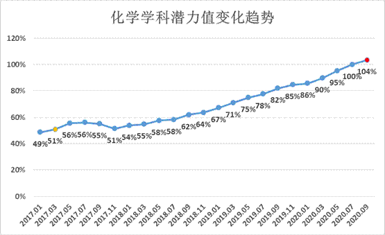 自2017年3月ESI学科排名的潜力值超过50%后,我校化学学科潜力值一直保持在稳步增长的趋势。在22个更新周期内,潜力值每期约增加2.5%。化学学科顺利入围ESI前1%,使我校成为迄今为止唯一有三个学科进入ESI全球排名前1%的中医药类高校,意味着我校临床医学、药理学与毒理学、化学学科均已进入国际高水平学科行列。