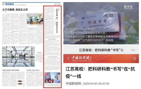 我校积极转化学科科研优势,用中医药良方为抗击疫情保驾护航的事迹得到了多家央媒的持续关注。《光明日报》3月5日8版以《迸发在战“疫”一线的智慧力量》为题,中新社3月3日以《江苏高校:把科研科教“书写”在“抗疫”一线》为题,报道了我校国医大师周仲瑛教授团队和全国名中医汪受传教授团队受江苏省卫健委委托参与制定江苏省新冠肺炎相关中医诊疗方案,以及学校根据周仲瑛教授献方制作中药香囊赠送前线医护人员、患者及南京本地市民、一线抗疫工作者的事迹。3月6日,新华社以《小香囊,大用处》为题刊发专题视频报道,介绍我校研制中药香囊助力抗疫情况。