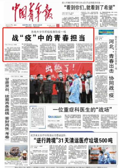 自疫情发生以来,青年学子也以高度的责任心和使命感为疫情防控作出积极贡献。我校寒假留校学生自发组成“‘囊’中留‘香’大学生志愿者服务团”,为抗疫一线亲手制作中药香囊的故事被《中国青年报》3月4日头版头条以《战“疫”中的青春担当》为题关注报道。此外,2月19日,中央广电总台国际在线《高校“云端”开学第一课 天涯共同窗》报道了我校和其他兄弟高校开展线上教学情况。