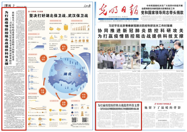 3月2日,习近平总书记在北京考察新冠肺炎防控科研攻关工作时强调,要协同推进新冠肺炎防控科研攻关,为打赢疫情防控阻击战提供科技支撑。我校国医大师周仲瑛教授团队作为中医抗疫科研团队代表和军事科学院、清华大学等科研工作团队接受了新华社专访,团队成员吴勉华教授、叶放教授介绍了团队积极响应以习近平同志为核心的党中央号召,在周仲瑛教授指导下大力开展抗疫应急研究、制定新冠肺炎中医辨治方案、为抗疫民众提供中医药健康服务的相关工作进展和成效。新华社通稿《为打赢疫情防控阻击战提供科技支撑——习近平总书记在北京考察新冠肺炎防控科研攻关工作时的重要讲话指明方向催人奋进》在3月3日的《人民日报》2版、《解放军报》头版、《光明日报》头版、《经济日报》2版、《中国青年报》2版、《法制日报》2版等多家央媒全文刊发。新华社《新华全媒头条》图文和视频报道阅读量均达百万人次。