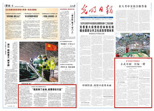 《人民日报》2月18日6版以《江苏派出2494名援鄂医疗队员——“既然到了战场,就要把仗打赢”》为题,关注报道了由我校多所附属医院医护人员组成的国家中医医疗队(江苏)在武汉江夏大花山方舱医院的工作情况。《光明日报》2月15日头版、2月26日头版、3月11日5版多次在重要版面分别以《方式不同 目标一样——走进武汉首家中医方舱医院》《好医配好药 打赢阻击战——武汉主战场中医抗击疫情纪实》《辨证施治展身手 抗疫有“方”显担当——江苏中医药人驰援湖北抗疫一线》为题重点报道了来自我校各附属医院的江苏中医药人在湖北抗疫一线日夜奋战,以实际行动将“相信中医”写进患者心坎里的感人事迹。武汉14所方舱医院全部完成历史使命正式休舱后,《光明日报》3月11日7版“战‘疫’一线大家谈”专栏专题刊发了部分支援方舱医院一线专家署名文章,其中史锁芳教授以《发挥中医优势,全力解决患者痛苦》为题介绍了江夏方舱医院中医诊疗开展情况。《科技日报》2月20日以《南京97岁重症患者被成功治愈,怎么做到的?》为题介绍了我校附属南京医院在国医大师周仲瑛教授团队制定的中医辨治方案指导下,采用中西医结合诊疗方法成功救治新冠肺炎确诊患者的案例。