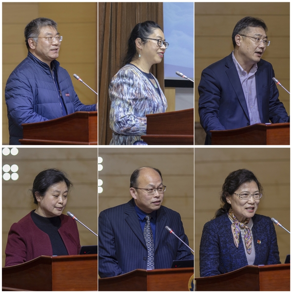 附属医院院长翟玉祥(上左)、鼓楼临床医学院党委书记彭宇竹(上中)、苏州附属医院院长徐俊华(上右)、扬州附属医院党委书记、院长沈雨春(下左)、盐城附属医院院长顾月星(下中)、附属康缘药业副董事长凌娅(下右)作交流发言