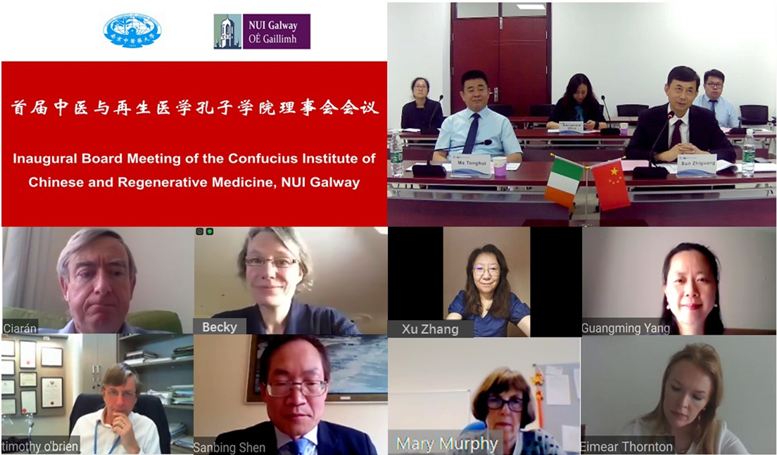 近日,我校与爱尔兰国立大学(高威)合作共建的中医与再生医学孔子学院召开首届理事会会议。南京中医药大学副校长孙志广教授,医学院•整合医学院院长麻彤辉教授,国际合作与交流处处长、国际教育学院院长张旭教授,孔子学院中方院长杨光明教授等中方理事参加会议。爱尔兰国立大学(高威)校长Ciarán Ó hÓgartaig教授,国际副校长Becky Whay教授以及医学院院长、孔子学院外方院长Timothy O’Brien教授、孔子学院外方副院长Shen Sanbing教授作为外方理事参加会议。本次会议以视频会议形式在线召开,孙志广主持会议。
