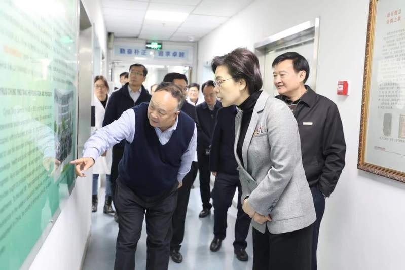 在中药资源产业化与方剂创新药物国家地方联合工程中心、江苏省中药资源产业化过程协同创新中心,徐缨听取了中心主任、岐黄学者段金廒教授就中心建设发展情况的介绍,对中心不断破解制约中药产业高质量、可持续发展的关键科学问题和共性技术问题,秉承“源于农田,归于农田”的循环经济理念,创新提出中药资源循环利用理论和绿色发展策略,构建了适宜中药废弃物及副产物生物转化、化学转化和物理转化循环利用的工程技术体系,实现了将科技成果转化为富民产业培育及循环经济发展的中药材产业精准扶贫模式表示充分赞赏。她指出,高水平科技自立自强是实现高质量发展的必由之路,高校始终是科技创新与产业变革的重要策源地,中医药要紧抓机遇、发挥优势,努力在科技强国、健康中国、乡村振兴等国家战略中贡献中医药力量。