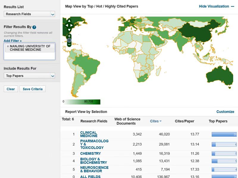 最新数据显示,本期药理学与毒理学学科全球共有1169个机构进入ESI全球前1%,我校该学科位列全球第115位,排名百分位0.0984%(即0.984‰)。截至目前,我校共有药理学与毒理学、临床医学、化学、生物学与生物化学和神经科学与行为学5个学科进入ESI全球前1%,是唯一拥有5个学科进入ESI全球排名前1%的中医药院校,也是唯一有学科进入ESI全球排名前1‰的中医药院校。
